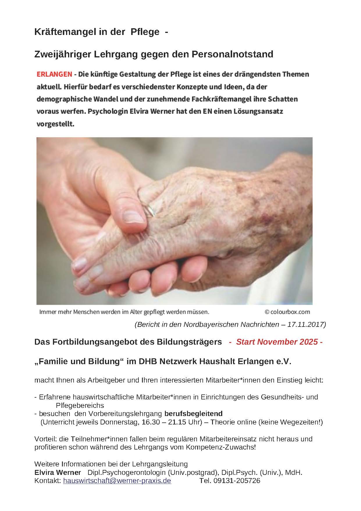 - Elvira Werner, Lehrgangsleitung "Gepr. Fachhauswirtschafter/in", Dipl. Psychogerontologin (Univ.postgrad) und MdH
