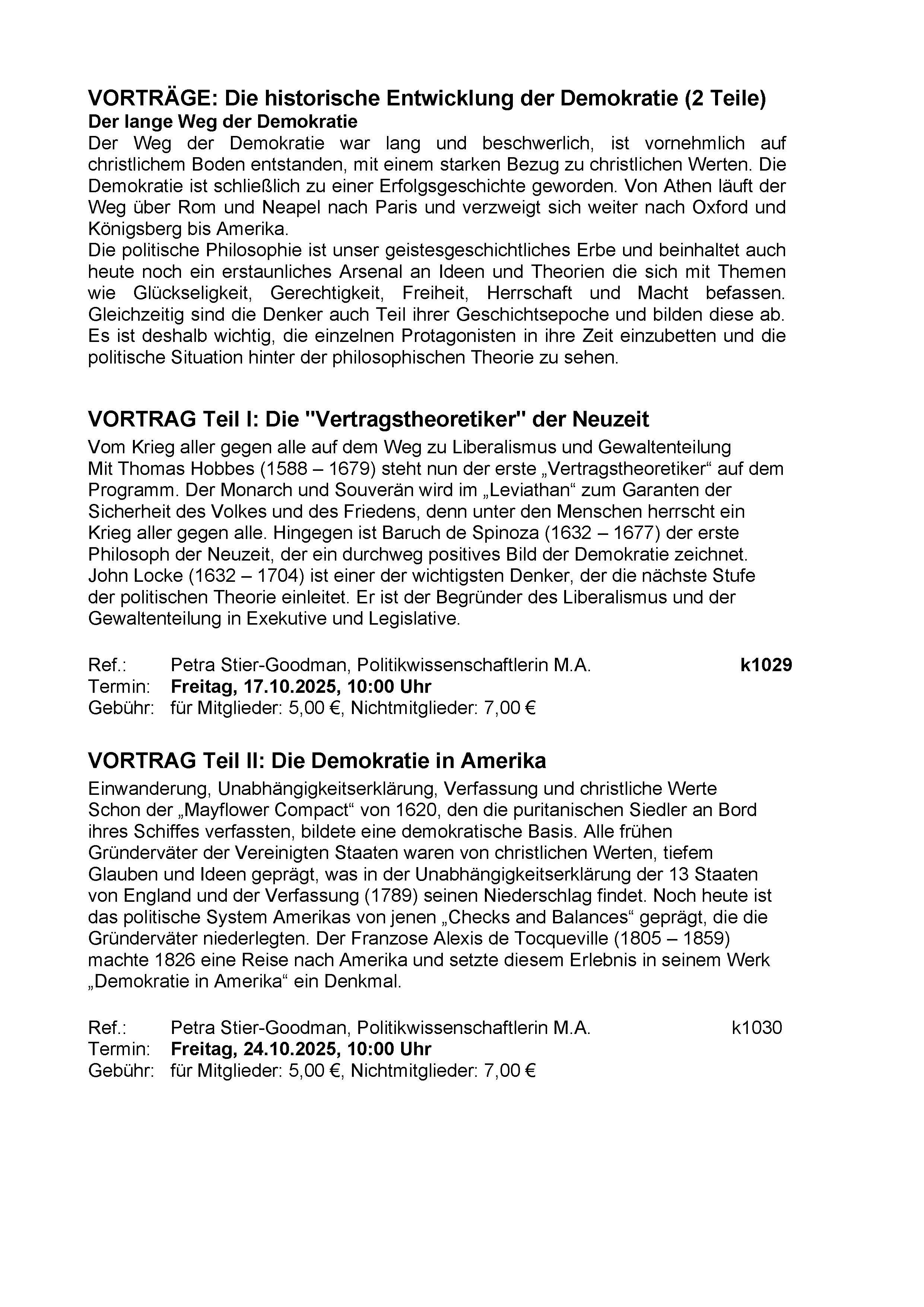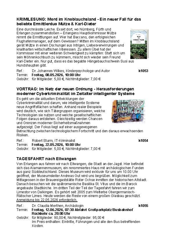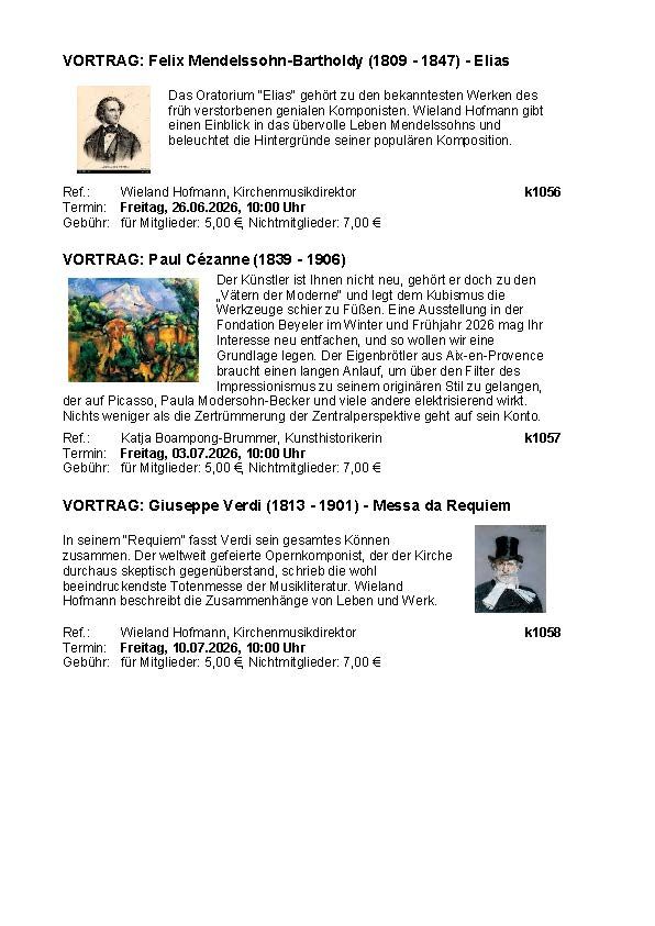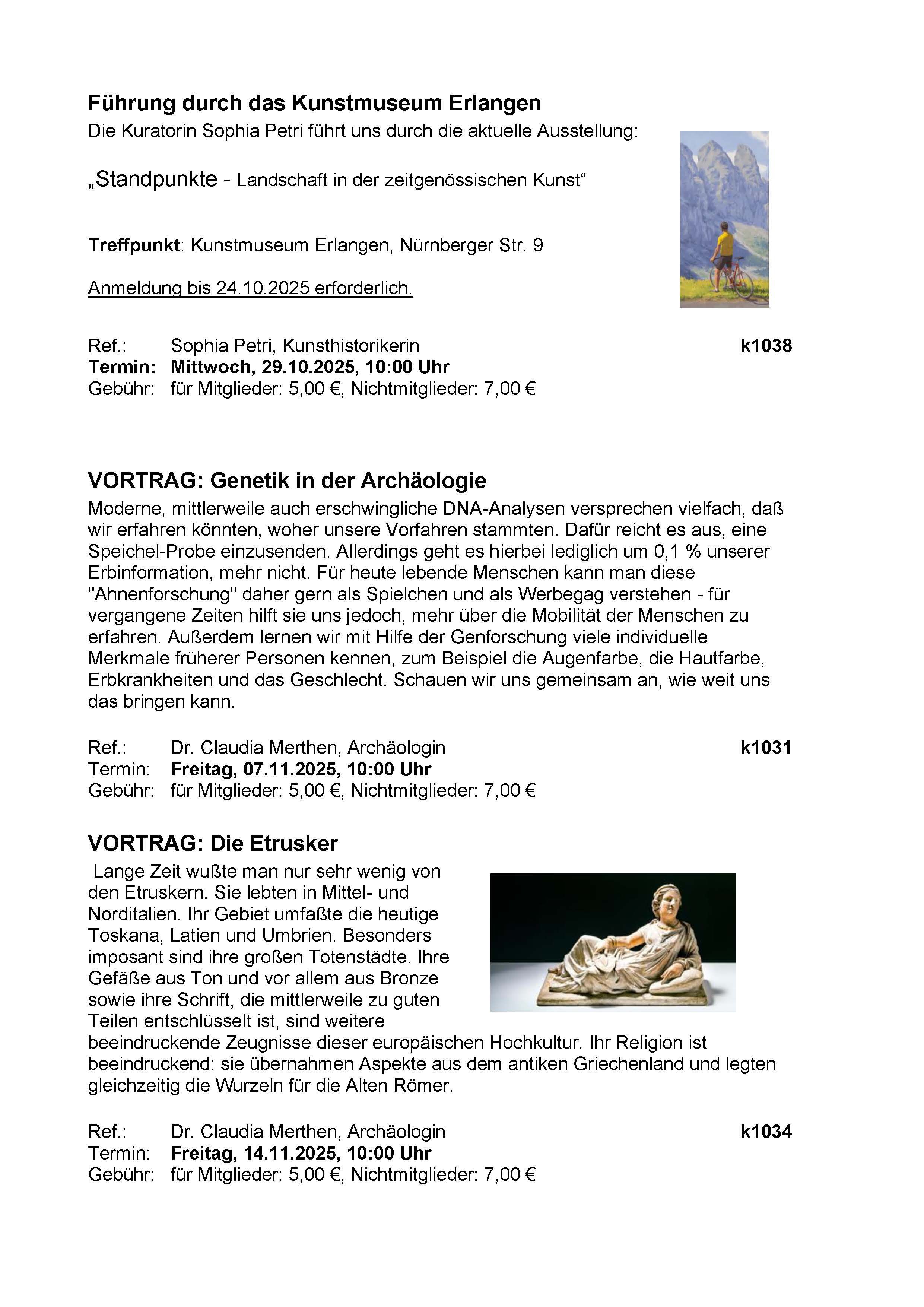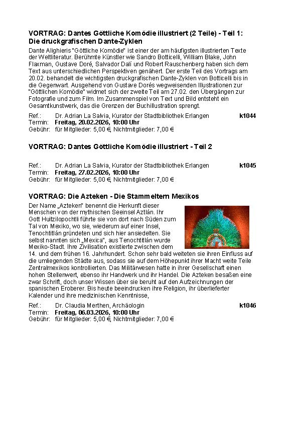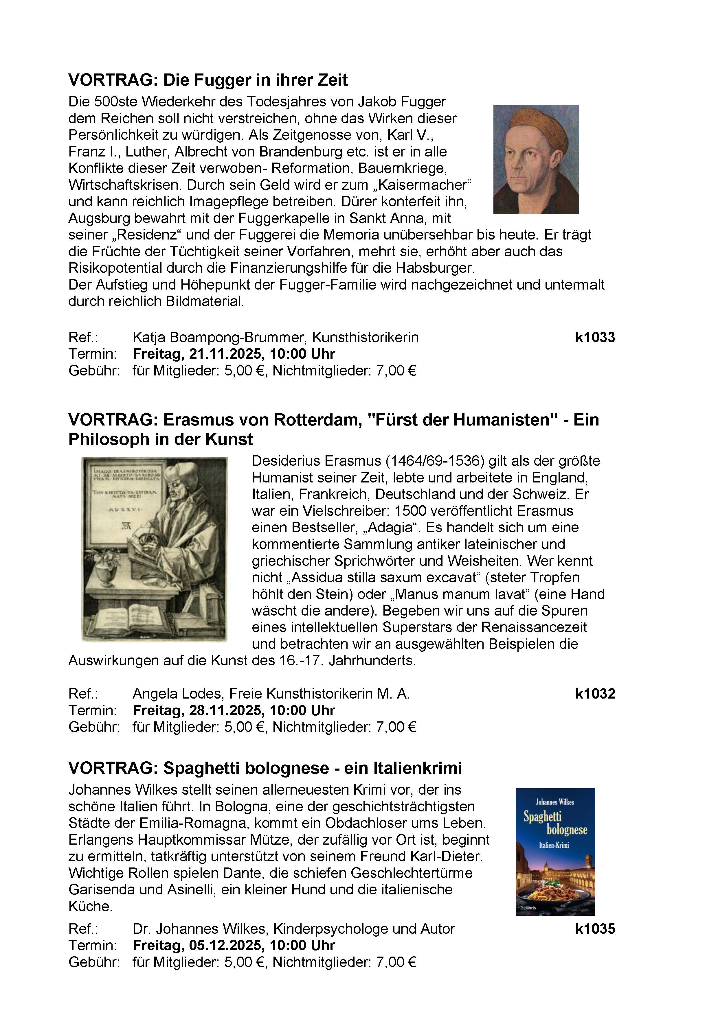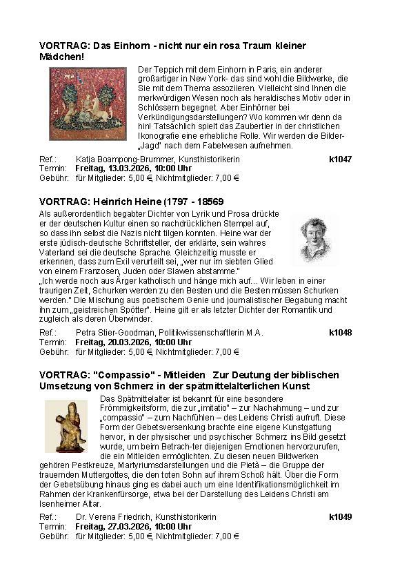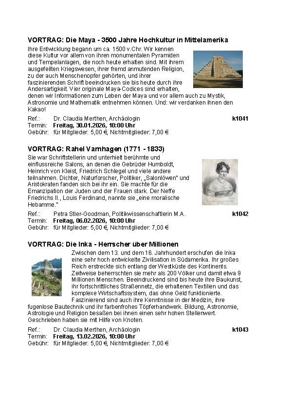 Unsere Vorträge finden jeweils am Freitag von 10 bis 12 Uhr statt. Sie können in Präsenz, aber auch online gebucht werden. Die Teilnahmegebühr beträgt 5 € für Mitglieder und 7 € für Nichtmitglieder.