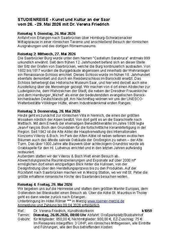 Die Reisen führten bisher u.a. nach Oberfranken zu den Markgrafenkirchen, ins Stammland der Staufer nach Baden-Württemberg und zu den Kathedralen in die Champagne. Im Herbst bewegen wir uns in Trier auf den Spuren der Römer und ihrem nachhaltigen Erbe.